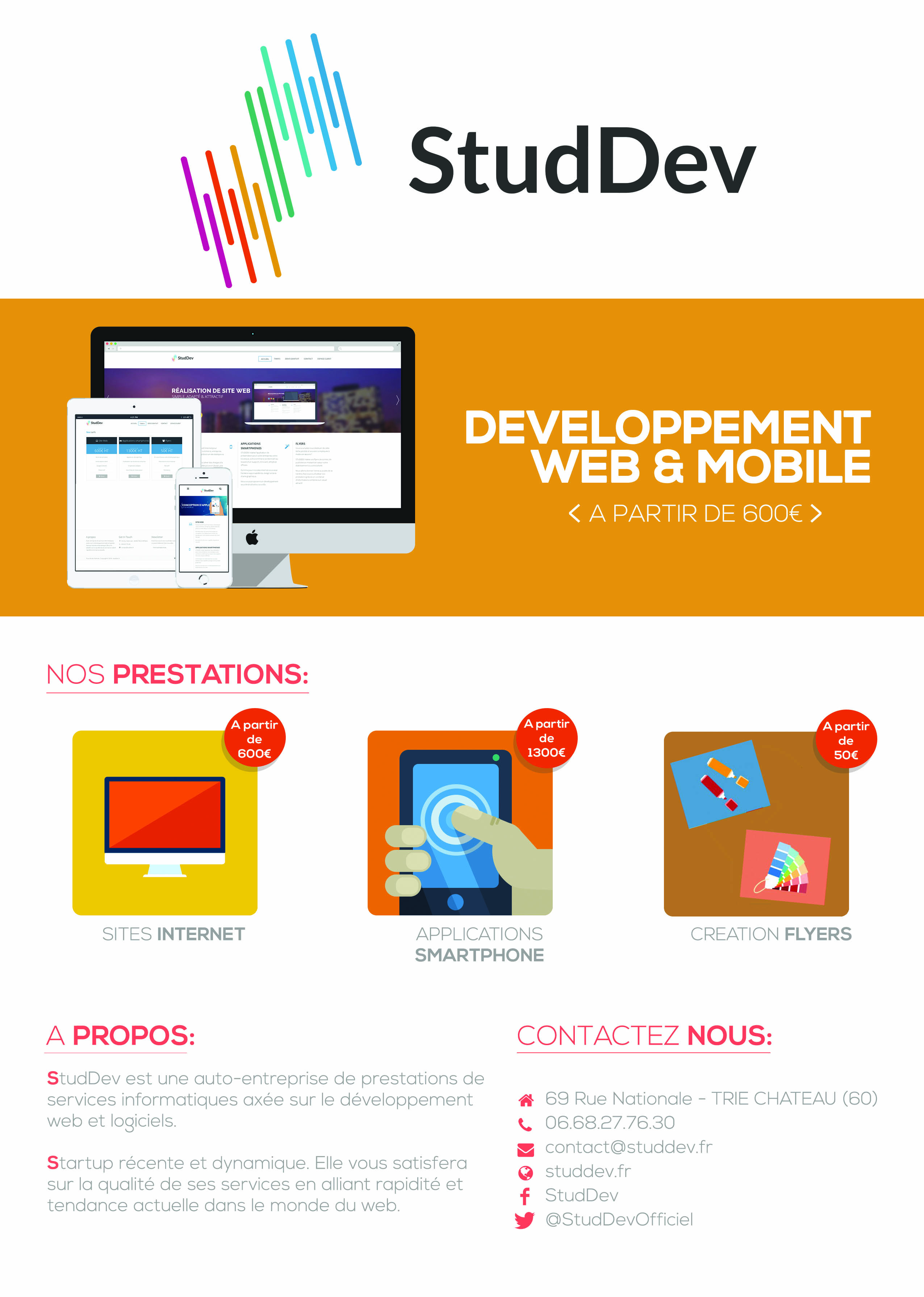 Le logo s'est alors retrouvé mutlicolor et les flyers sur des bases de cartoon avec des couleurs chaudes. Le client avait pour but de démarcher des TPE donc voulait que le prix soit affiché également. Merci à Studdev pour sa confiance.